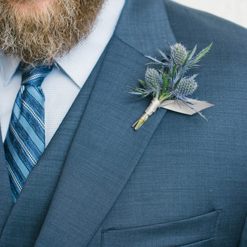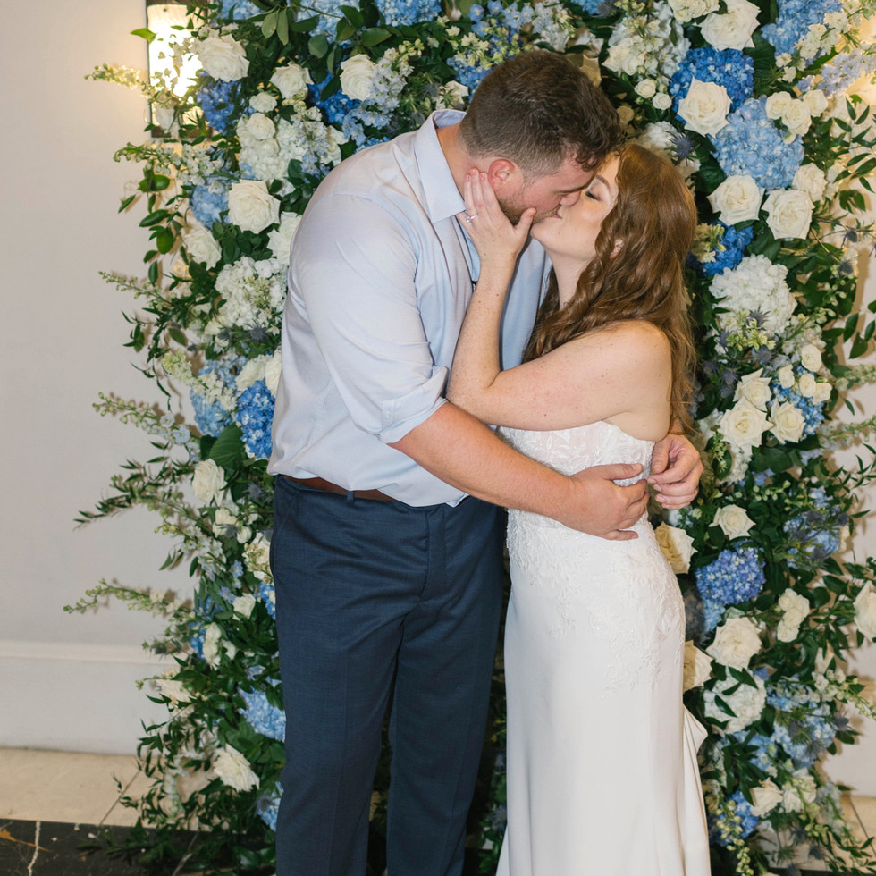 Cassie and Kurt's wedding showcased how beautifully blue and white colors can be combined. There are a variety of shades of blue that you can incorporate into your wedding flowers. Although blue flowers can be challenging, many options exist, such as Blue Thistle, Hydrangea, Delphinium, and tweedia, with new breeds also being introduced, such as True Blue Mums. Kurt's Boutonniere was designed with Blue Thistle and simple dark greenery. Cassie loved the Panda Anemone, a white bloom with what can appear to be a navy blue center; this combination of white and blue represents the color of a clear sky, symbolizing a relationship free from chaos and filled with devotion. Blue flowers are also associated with open communication and clarity, essential in a successful